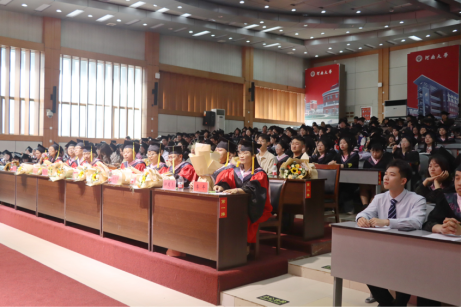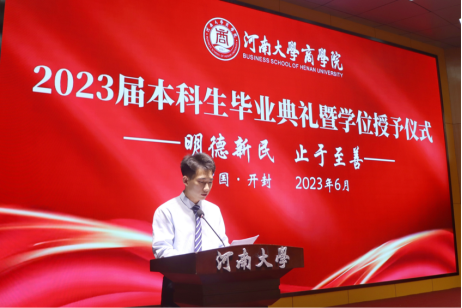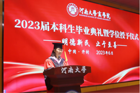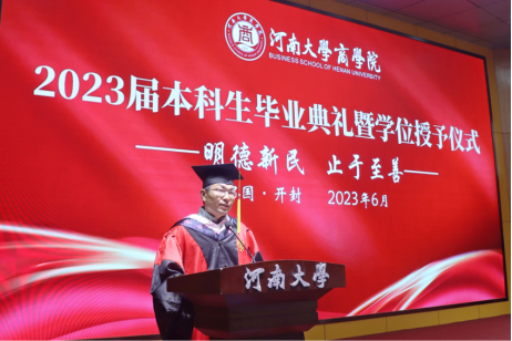 2019级电子商务专业姚旺作为毕业生代表发言。他代表全体毕业生感谢学院及老师四年来的栽培和教育,深切表达了对母校的眷恋不舍。他呼吁毕业生们奔赴五湖四海应时刻不忘河大之魂,生逢其时,当立鸿鹄之志,做新时代的奋斗者、搏击者、奉献者。